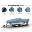 SProtect your investment with our premium Fish & Ski Boat Cover, expertly crafted from either Cover Rite or WeatherMAX 80 materials to offer unparalleled defense against UV rays, rain, and potential physical damages. Our Boat Covers are engineered for durability, featuring air vents to minimize condensation, adjustable straps with push clip buckles for a secure Trailerable Boat Cover fit, and a lightweight design that promises ease of handling, storage, and transportation. The double-stitched reinforcement ensures long-lasting protection. Choosing our Custom Boat Covers not only extends the lifespan of your vessel but also significantly reduces maintenance. Available in various dimensions and color options, each cover can be customized with logos and graphics for that personal touch - ensuring your Custom Fit Boat Covers meet both protective needs and stylistic preferences. Elevate your boating experience with a cover that stands the test of time. You can even customize ski boat covers as per your requirements.