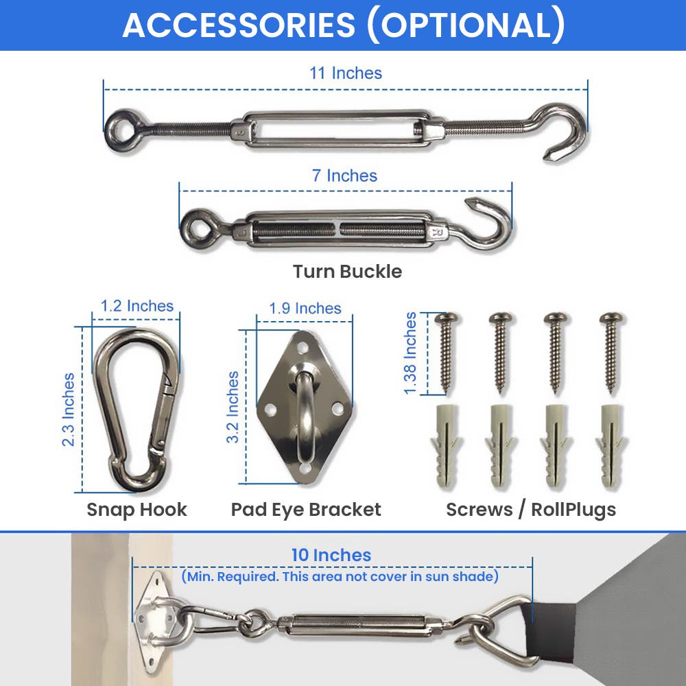 Our sun shade sails for patios suit a range of settings, from home gardens to business areas. Improve your outdoor get-togethers, shield your pool area, or set up a pleasant outdoor work area. We offer additional items to help with setup, such as turnbuckles, snap hooks, and pad eye brackets.