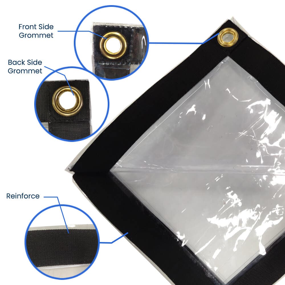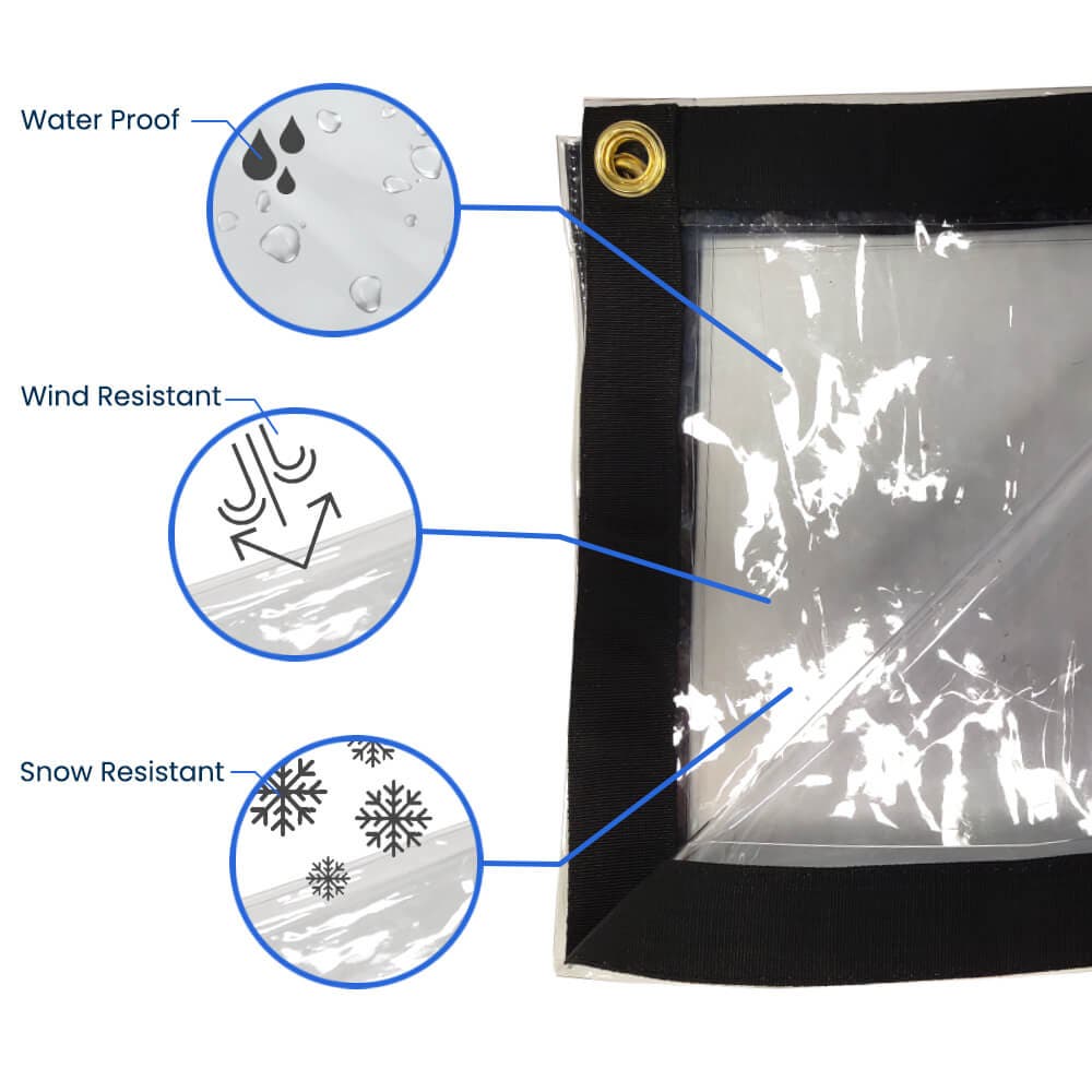 Created for longevity, this professional clear waterproof tarp features quality 20 mil thickness and measures 8' x 20' for extended coverage. The clear tarp with grommets includes quality brass grommets installed every 24" along borders for secure anchoring. Professional double seams and technical stitching ensure reliability, while UV-blocking compounds prevent degradation. Each clear tarp is manufactured using resilient vinyl that stays transparent while maintaining strength.
