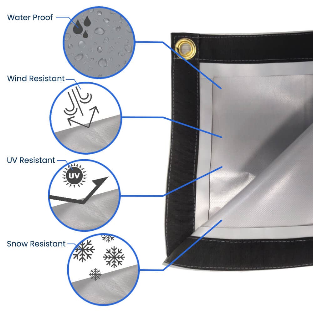 Our heavy duty waterproof tarps are crafted from Tarp Tuff material, featuring 1000 denier and 18 mil thick PVC-coated polyester fabric. This tough design resists tears and abrasions, making it ideal for protecting sharp-edged tools or withstanding high winds. Rust-free brass grommets spaced every 24", ensure secure attachment, even during storms or adverse weather conditions. The tarp’s waterproof and UV-resistant properties provide year-round protection against moisture and fading, while the vinyl-like finish adds a premium look and feel. Available in a range of colours, these tarps can be easily matched to complement your outdoor setup.