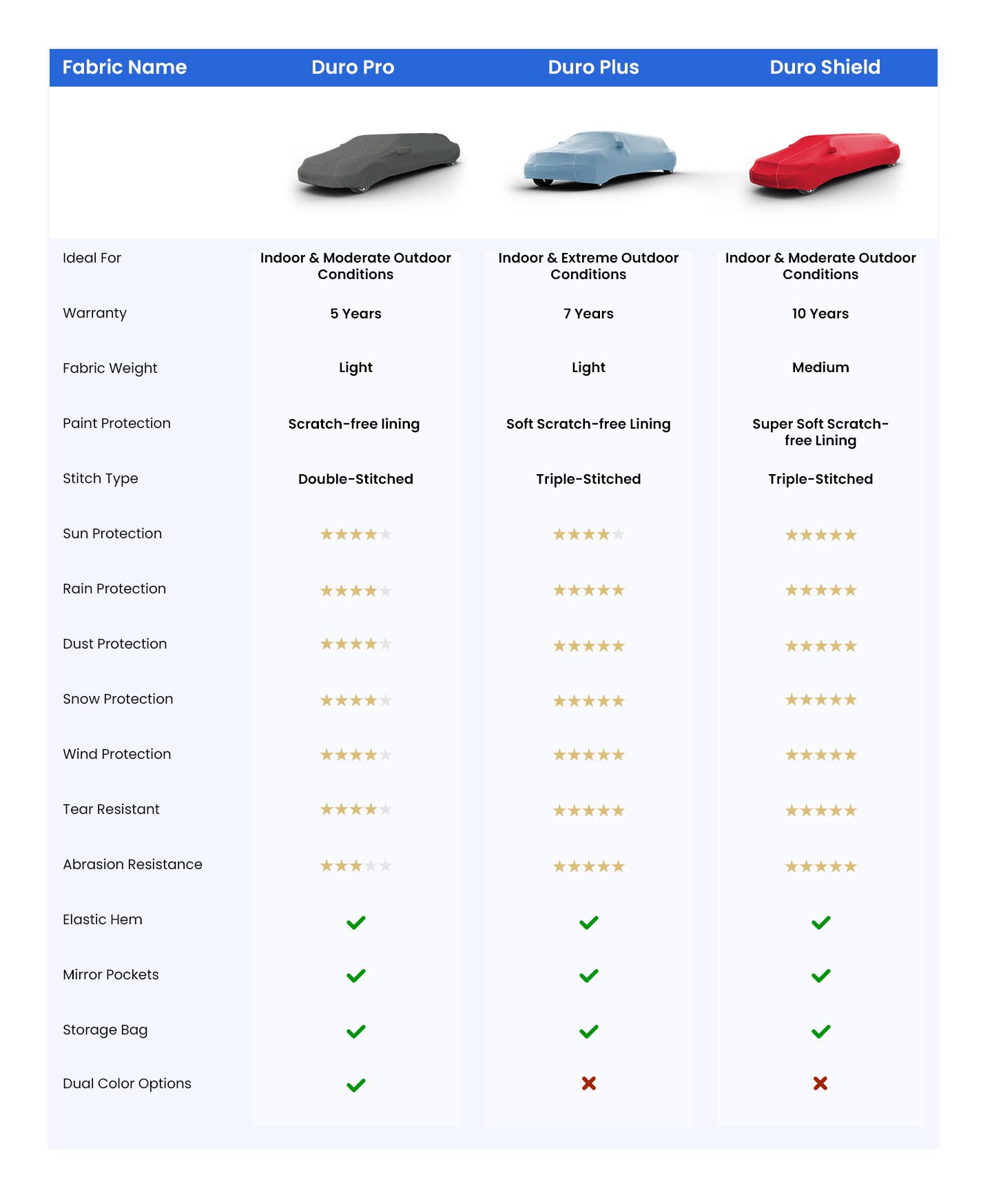 Your made-to-order car cover comes with a complimentary storage bag designed to fit the cover perfectly. Just fold, pack & store until you need it next, your cover’s storage bag will help you keep it sorted.