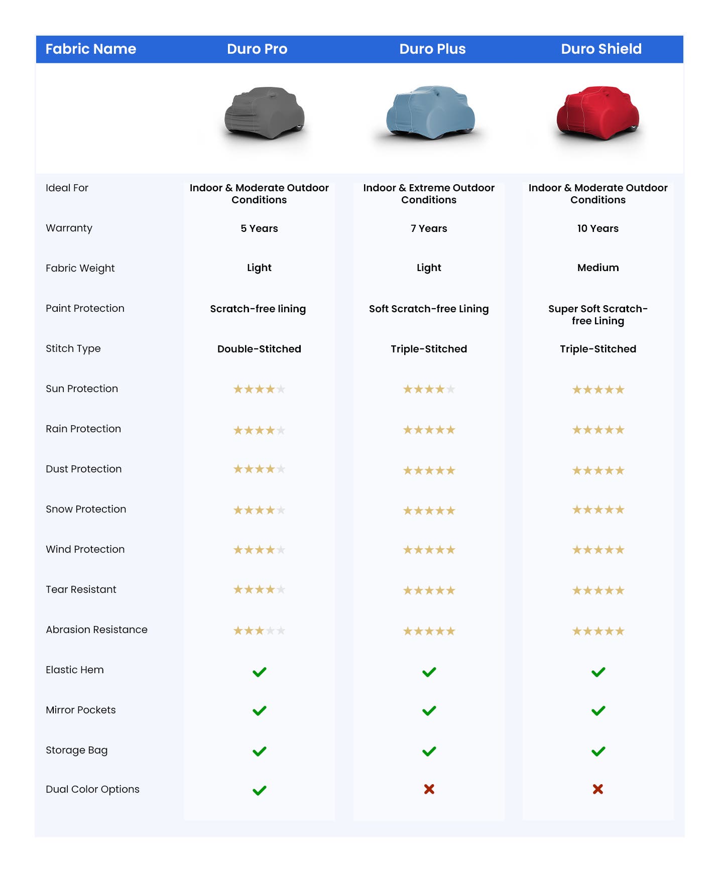 Your made-to-order car cover comes with a complimentary storage bag designed to fit the cover perfectly. Just fold, pack & store until you need it next, your cover’s storage bag will help you keep it sorted.