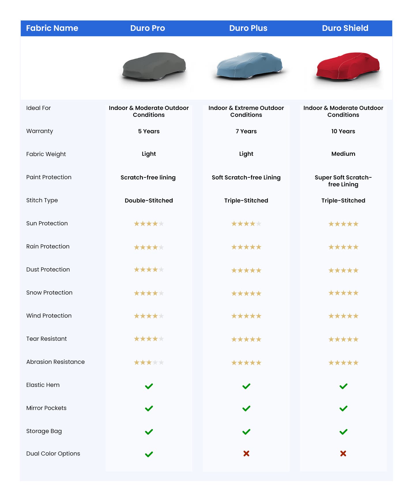 Your made-to-order car cover comes with a complimentary storage bag designed to fit the cover perfectly. Just fold, pack & store until you need it next, your cover’s storage bag will help you keep it sorted.