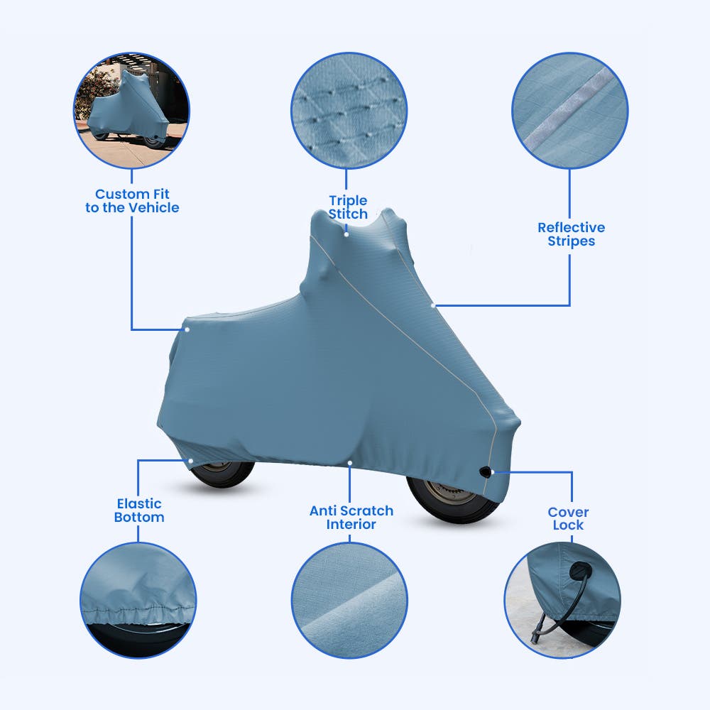 In the rhythm of city life, your scooter serves a purpose for more than just a machine—it's your trusted vehicle of choice. Our snug fit Scooter Covers are crafted with precision, care and devotion to match your scooter's sleek lines and corners that need snug fit protection. Purchasing a custom-made cover for your Scooter eliminates the hassle of ensuring its protection. Our cover comes with a lifetime guarantee and is crafted from durable materials, offering year-round protection against all weather conditions. As compared to ready-made covers with loose-fitting, our Scooter covers provide year-round protection because they are made to hug your Scooter’s curve from every corner.