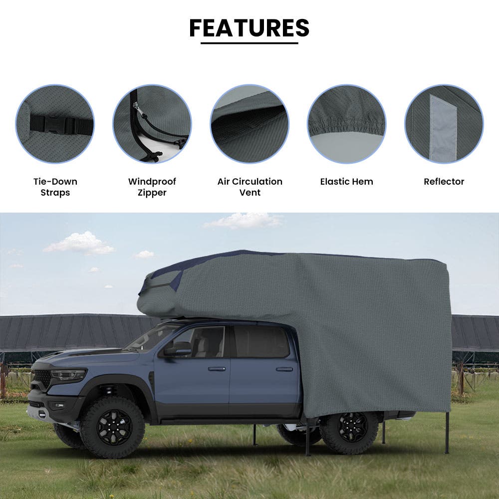 Truck camper covers safeguard your vehicle from environmental damage and dirt. The strong, weather-resistant material ensures durability and long-lasting use. Easy to install and remove, it provides reliable protection for your camper. Perfect for storage, travel, or outdoor use, it maintains cleanliness, preserves vehicle quality, and enhances convenience and peace of mind during daily or seasonal use.