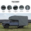 The truck camper cover is robust and waterproof. It shields the camper from harsh weather and keeps it clean. The straps and fit are secure, and the material resists wear and tear. Easy to put on and remove, it’s a solid choice for camper protection.