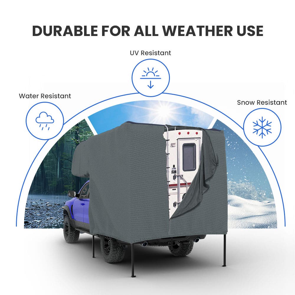 This truck camper cover protects my RV efficiently. The material is durable, water-resistant, and stays secure during wind. It covers the camper completely, keeping it clean and safe. I’m satisfied with the quality and how well it handles outdoor storage.