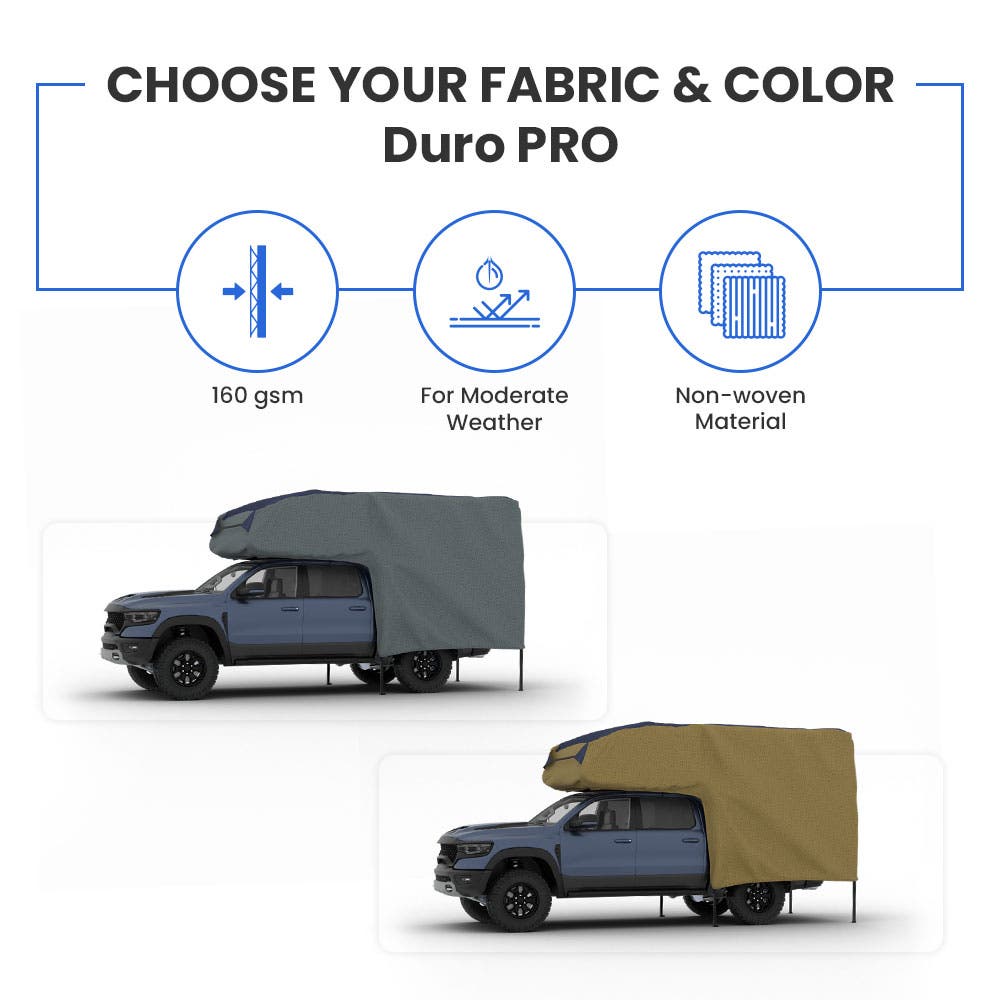 Ensure your truck camper remains in pristine condition with our specially designed Truck Camper Cover, featuring two premium material options: Cover Rite and Duro Pro. Select the complete Cover Rite variant for extensive water resistance, or opt for Duro Pro - with a durable Cover Rite top and sturdy Duro Pro side panel, customized for optimal protection. Our Cover integrates a mesh fabric to facilitate excellent airflow and a 3" reflective strip for improved visibility, ensuring safety and durability. It offers robust protection against weather elements, oxidation, and fading, while reducing maintenance needs by preventing mold and mildew. This Cover also preserves the interior from sun damage and retains resale value. Equipped with zipped side panels for easy access, weather-resistant straps, adjustable tensioner panels, and reinforced anchor points, our Cover is designed for a perfect fit. Customize your Cover with color choices and logo options to suit your style. Each purchase includes a storage bag, patch kit, optional ladder cap, and extra straps, providing all-season protection and peace of mind. You can even customize truck covers with us.
